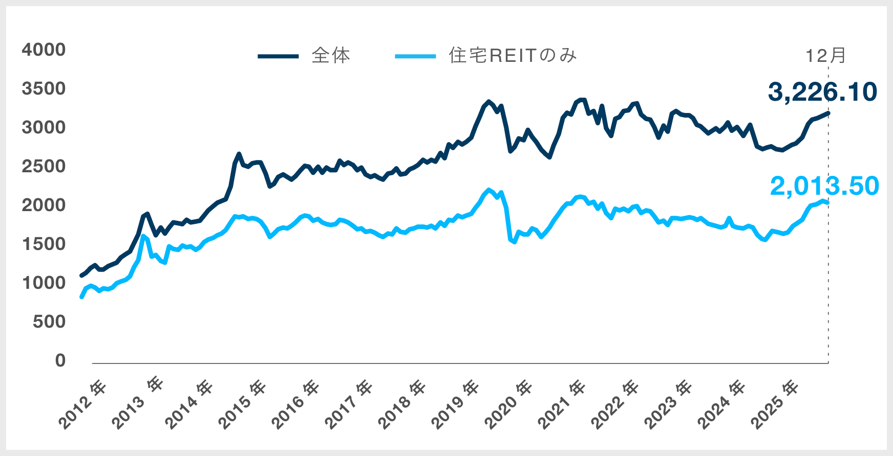 - 12月もJ-REITは概ね続伸が続きました。12月末時点の東証REIT指数は、先月末に引き続き2,000ポイント超を維持しました。また、住宅REIT指数は3,200ポイントを上回り、年初の2,600ポイント台から約600ポイント上昇するなど、好調が続いています。