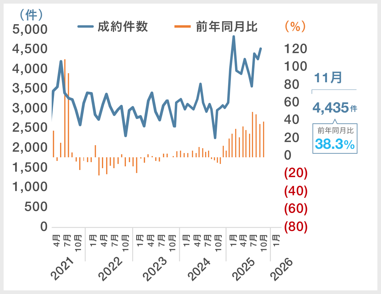 - 11月の首都圏における中古マンション成約件数は、引き続き4,000件台を維持しており、堅調な推移が続いています。一方、成約㎡単価は前年同月比ではプラスとなったものの、10月からはやや下落しています。