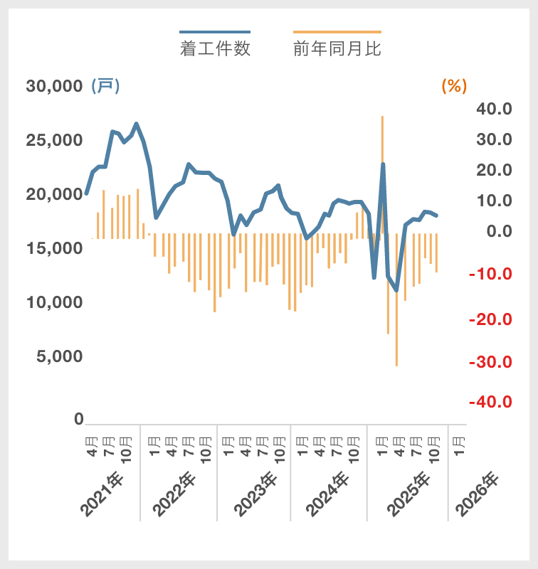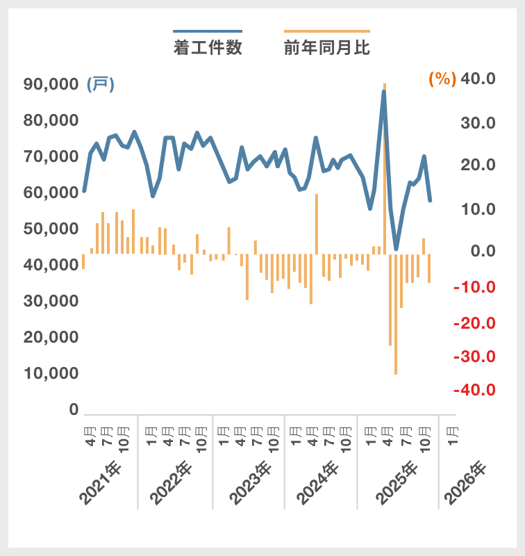 - 11月の新設住宅着工戸数は総数で6万戸を下回りました。持ち家は前年同月比で8か月連続のマイナスとなり、貸家も10月はプラスだったものの、11月は再びマイナスに転じました。こうした動きからは、建築費上昇の影響が強まっていることがうかがえます。