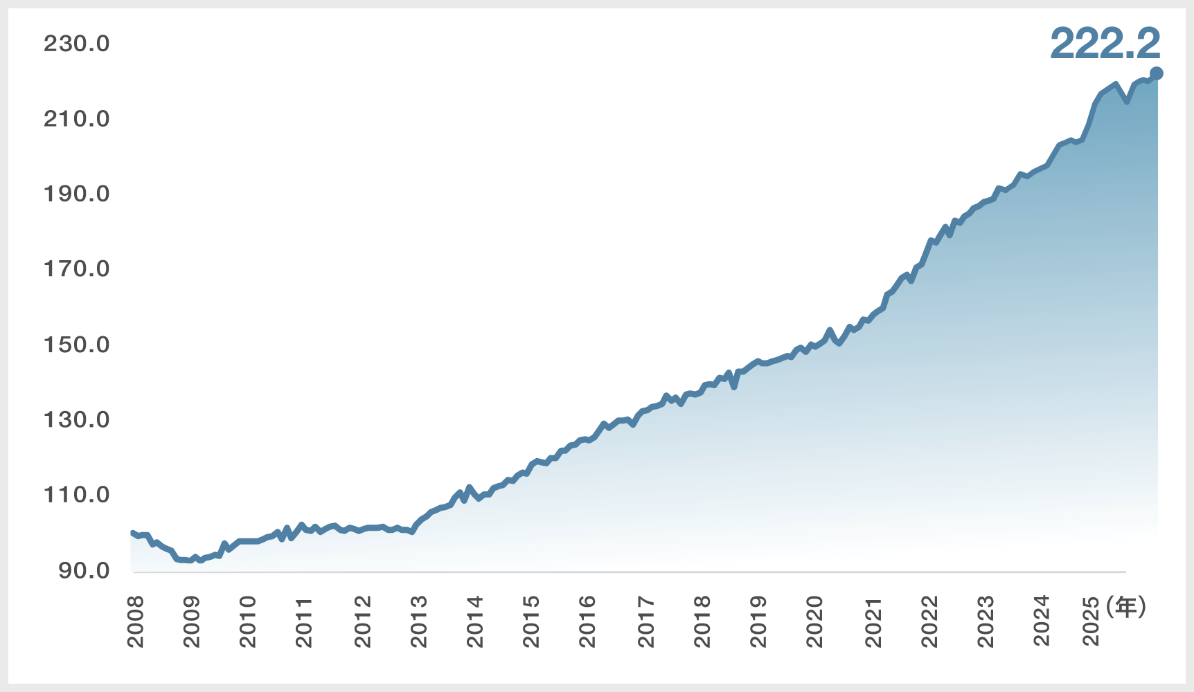 - 9月分の区分マンションの不動産価格指数は222.2ポイントとなり、最高値の更新が続いています。ただし、上昇幅は小さくなっており、上昇基調にはやや陰りも見え始めています。