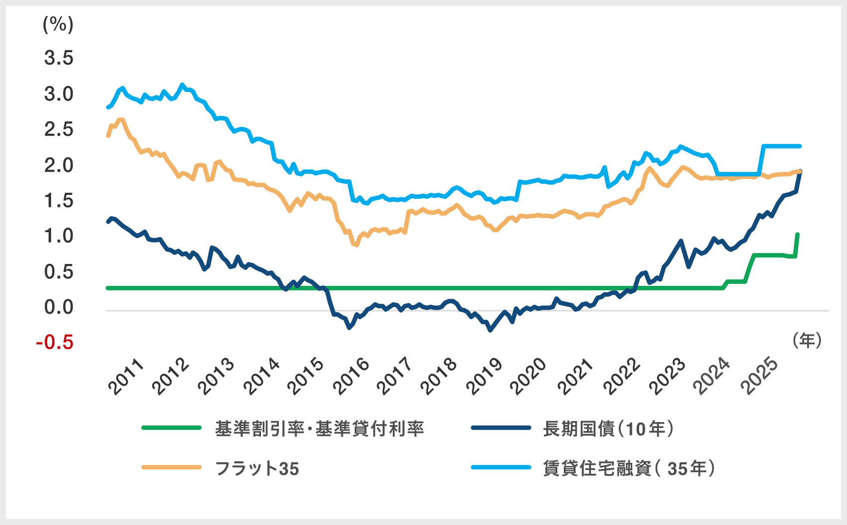 - 12月の日銀金融政策決定会合では、政策金利が0.75%へ引き上げられました。これを受けて基準金利は1%となり、長期国債金利も上昇しています。フラット35などの固定金利は現時点では横ばいとなっているものの、今後は上昇に転じる可能性があります。