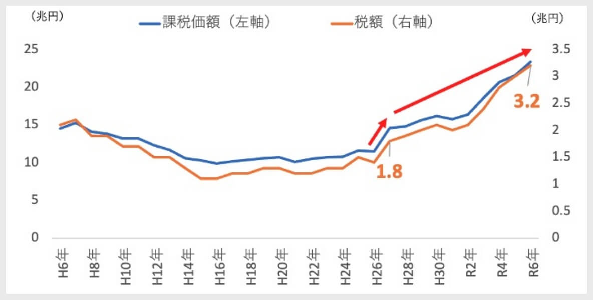 さらに、令和6年(2024年)の税額は3.2兆円となっており、制度改正直後の平成27年(1.8兆円)と比較すると約1.8倍に増加しています。これは、単なる制度変更の影響だけでは説明できない増加幅であると言えるでしょう。