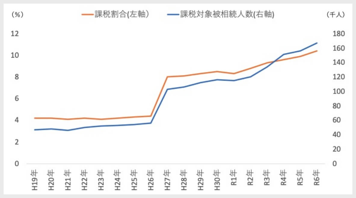 基礎控除改正により課税対象者が増加したことは周知のとおりですが、その後も課税割合は上昇を続け、令和6年(2024年)には初めて1割を超えました。これは、相続税が一部の富裕層だけの問題ではなく、より広い層に関わる税制へと変化していることを示しています。
