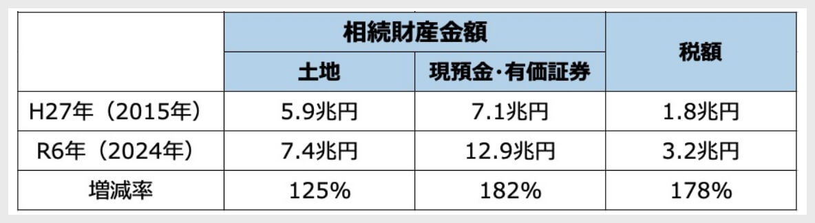増減率を見ると、地価上昇の影響もあり、土地は125%の増加となりました。一方で、現金・預貯金や有価証券は182%と大きく伸びています。そして、相続税額は178%と、金融資産の増加率に近い伸びを示しています。