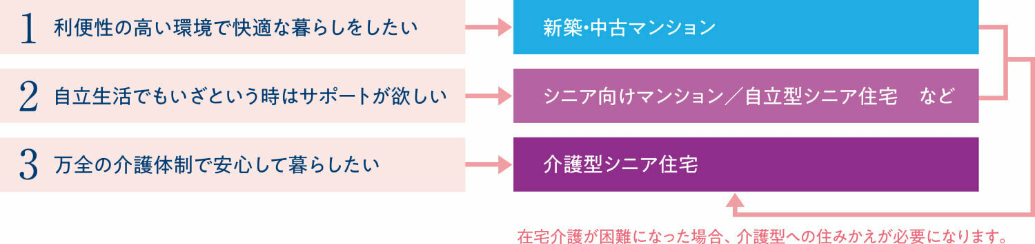 住み替えにはいくつかの選択肢があります。ご自身の希望だけではなく、年齢やお身体の状態によっても選ぶべき住宅が変わります。また住み替え後も様々な状況によっては、更なる住み替えが必要になる場合があることも理解しておきましょう。