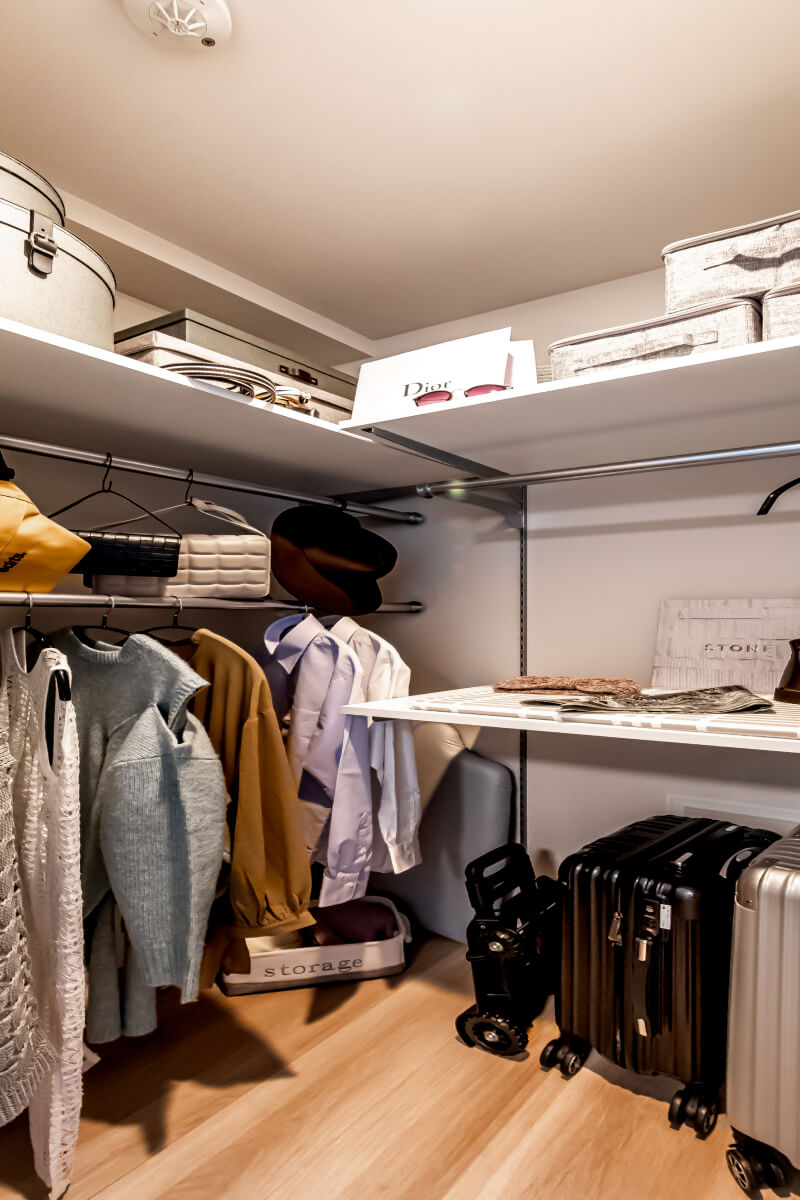 お手持ちのアイテムに合わせて自由にレイアウト変更可能な可動棚・可動ハンガーパイプを採用。また、壁面には付長押を設置して、更に収納量を増やしました。