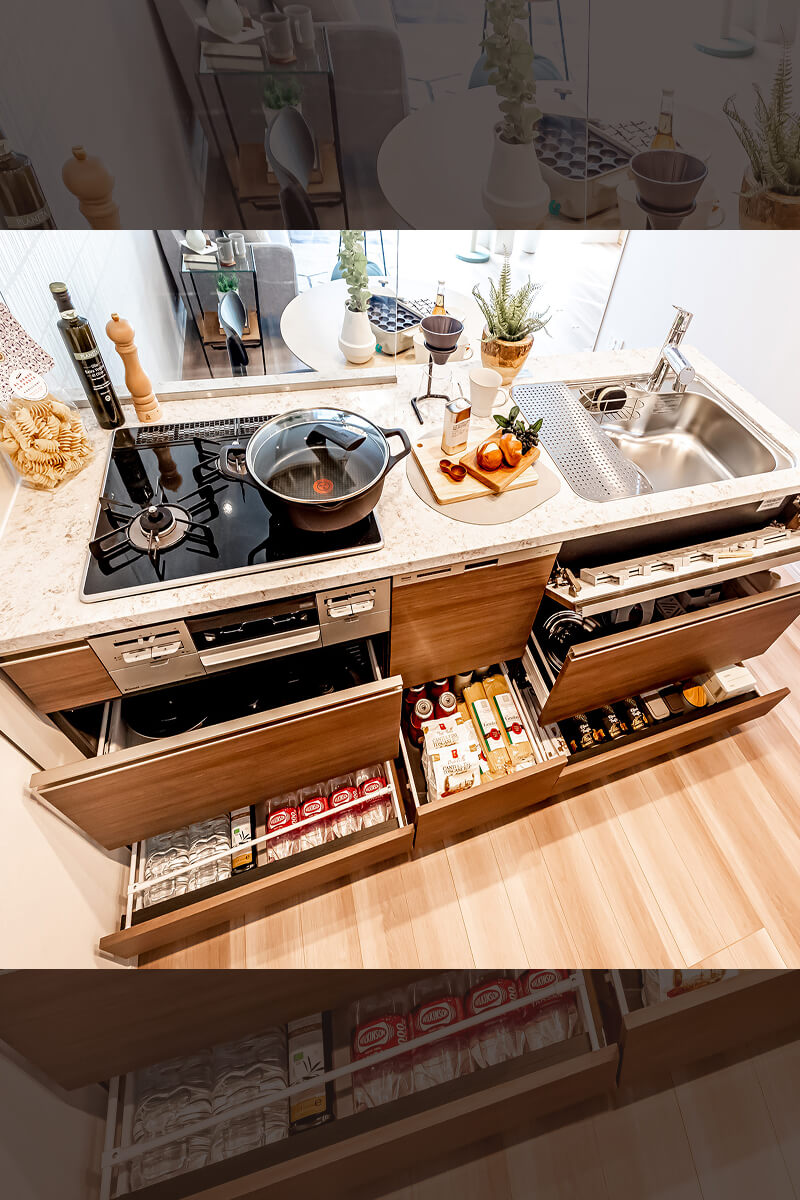 巾木引出収納や前面フラップ等、キッチン内部の収納量を最大限確保しました。また、シンク部分にはカウンターとフラットになる水切りプレートを設置して調理スペースを確保。食器を洗った後は水切りも出来るパンチング仕様です。