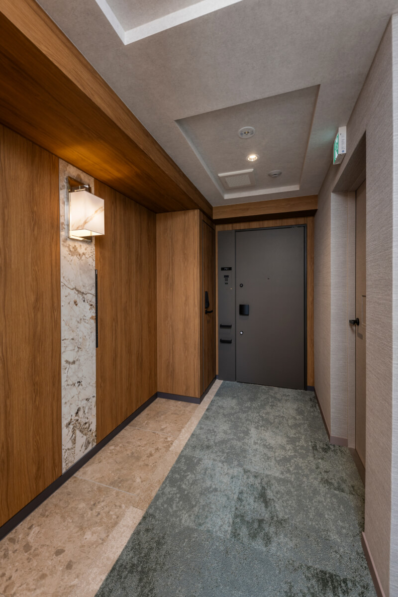 「1フロア1邸」という独立性を最大限に活かし、玄関前に格調高い設えのプライベートサイクルポートを設置。品格と機能性を両立しています。