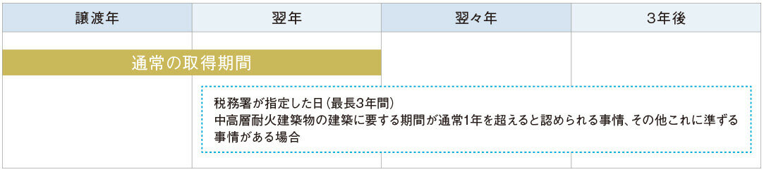 買換資産を取得すべき時期は、原則として、譲渡資産を譲渡した年の年末までに取得しなければなりません。ただし、一定の要件を満たす場合、先行取得や翌年中の取得も認められます。なお、買換資産となるマンションの建設に要する期間が1年を超える場合などは、やむを得ない事情とみなされます。そのため、買換期間の延長を申請することが可能です(最長で譲渡年の翌年の年末から2年間の延長が認められます)。