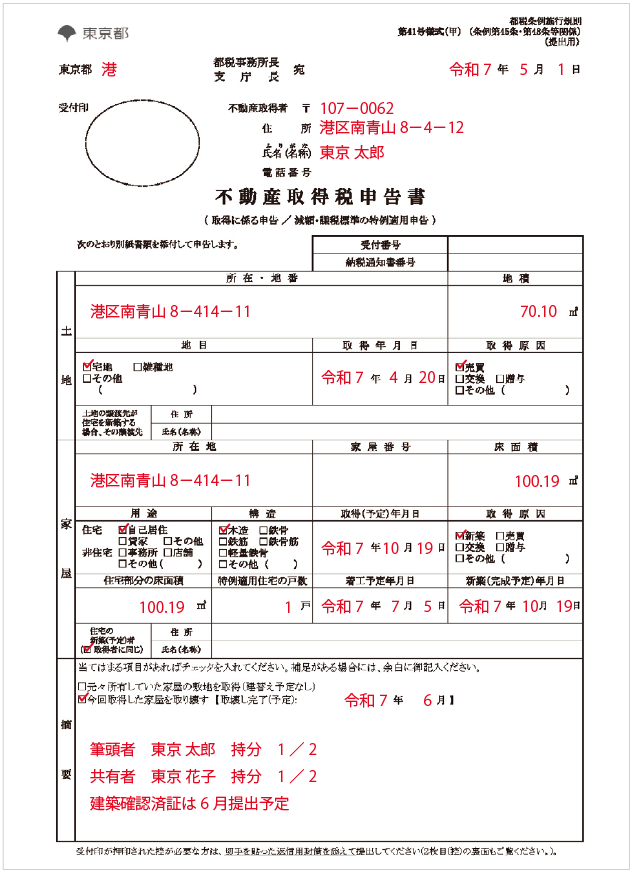 下記の不動産取得税申告書(取得に係る申告/減額・課税標準の特例適用申告)は東京都の書式です。自治体ごとに申告書の書式が定められており、添付書類等が異なることがあります。