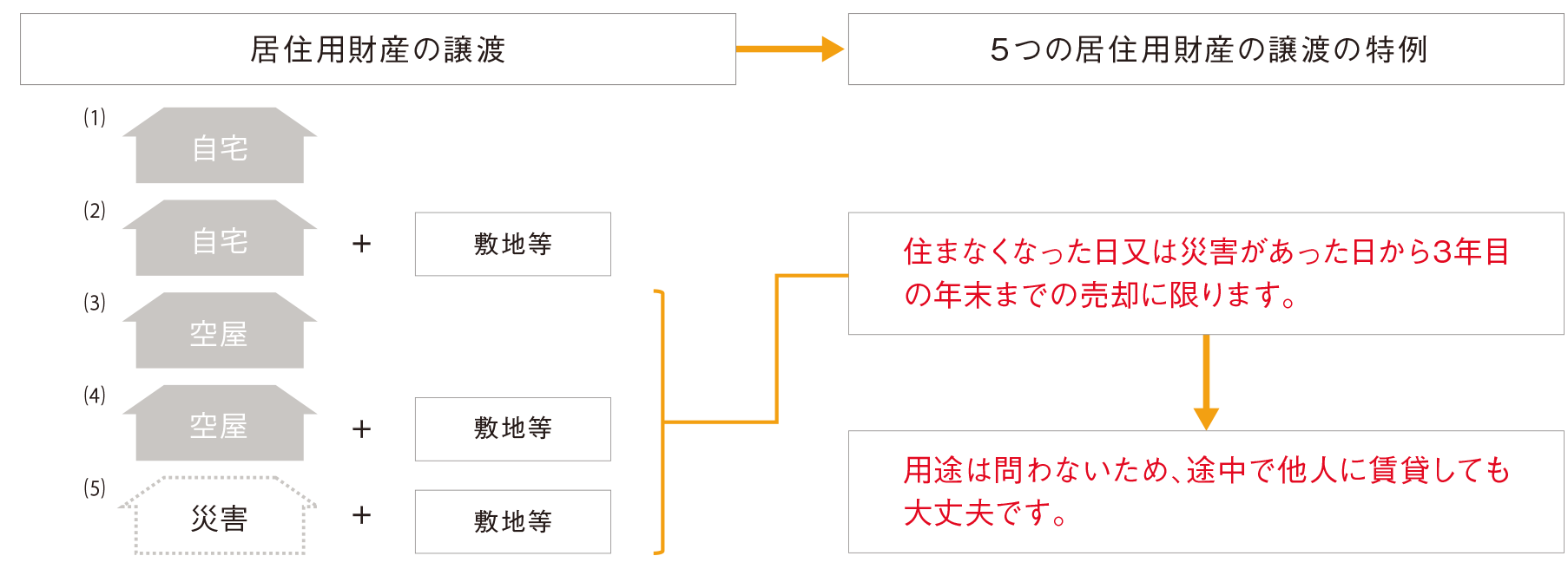 特例の対象となる自宅の売却は、原則として次の5つ形態によるもの(居住用財産の譲渡)です。
