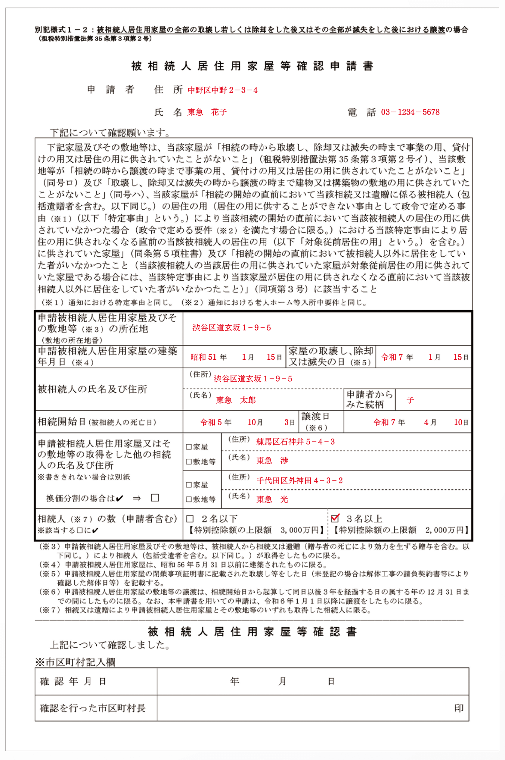 別記様式1-2:被相続人居住用家屋の全部の取壊し若しくは除却をした後又はその全部が滅失をした後における譲渡の場合