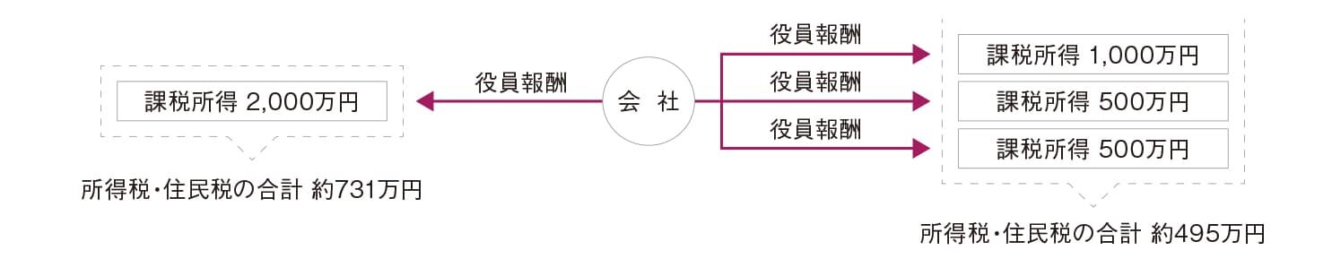 生計一の親族に対する報酬の支払いに関する制限は所得税より緩やかであるため、代表者に集中しがちな所得を事業活動に従事する同族役員や従業員に支払うことにより、所得分散を図り、所得税の超過累進税率の緩和を行うことができます。さらに、役員報酬等の支払先を相続人等とすれば、納税資金の確保と相続財産の膨張を防ぐ効果があります。