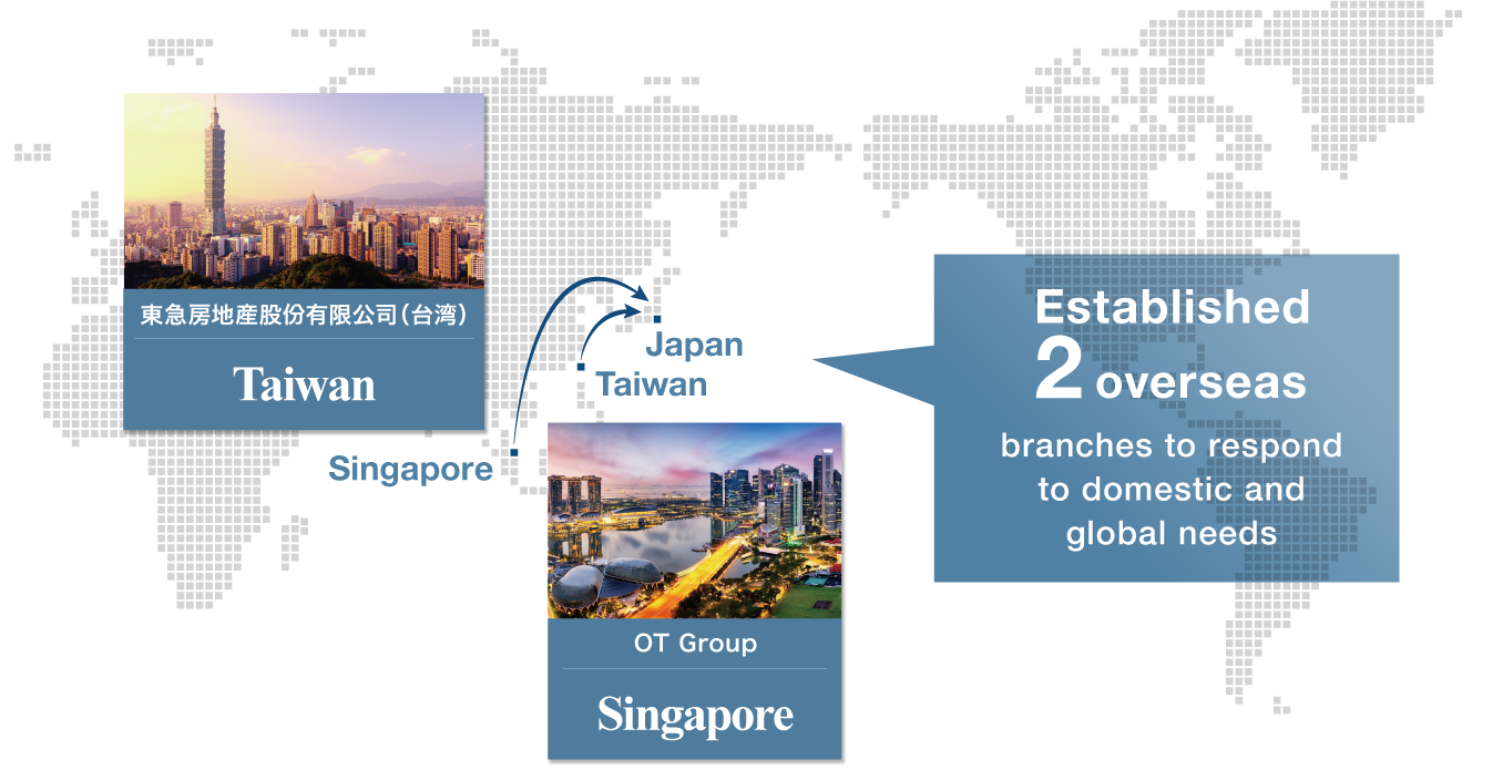 We have branches in Taiwan and Singapore, and we offer support to Japanese real estate investments locally. Each branch works together with our staff members in Japan to handle diversified investment projects.