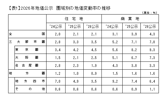 国土交通省は17日、26年の地価公示(1月1日時点)を公表した。全国の地価は全用途平均+2・8%(前年+2・7%)の上昇。住宅地、商業地とも5年連続で上昇が継続した(表1)。地価は全国的に引き続き高い状況にある。一方で、上昇の勢いをみると、22年から前年を上回る上昇を続けていた住宅地は横ばいとなった。建設コスト上昇に伴う住宅価格の高騰を背景に、価格上昇を吸収できる購買力がある都心を除き、上昇幅の縮小が目立つ地点が増えてきた。
