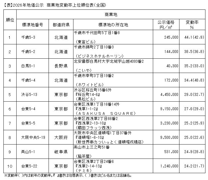 商業地の上昇率全国トップ10をみると(表)、インバウンド・再開発・高利便性マンション需要(住宅需要との競合)などの要因を擁する都市の地点が、高い地価上昇を示した。一部の地方では大手半導体メーカー進出も要因に加わる。北海道千歳市はラピダス進出により、千歳駅近くの「千歳5―3」が+44・1%(+42・1%)で全国トップの上昇率となった。