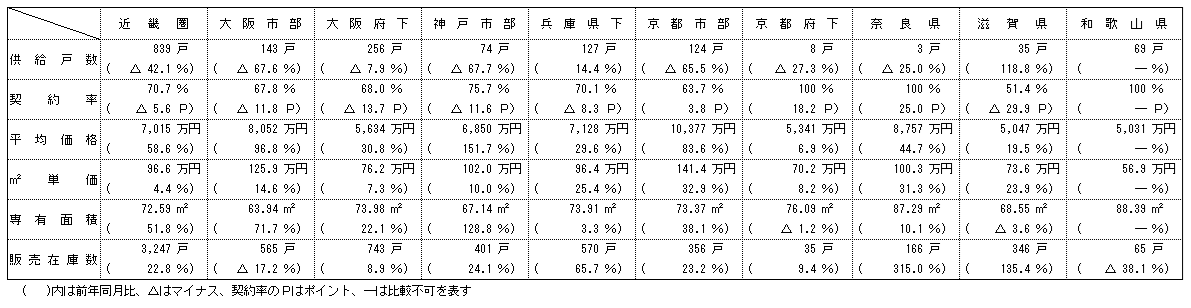 供給戸数をエリア別にみると、大阪市部が67・6%減の143戸、大阪府下が7・9%減の256戸、神戸市部が67・7%減の74戸、兵庫県下が14・4%増の127戸、京都市部が65・5%減の124戸、京都府下が27・3%減の8戸、奈良県が25・0%減の3戸、滋賀県が118・8%増の35戸、和歌山県が69戸。